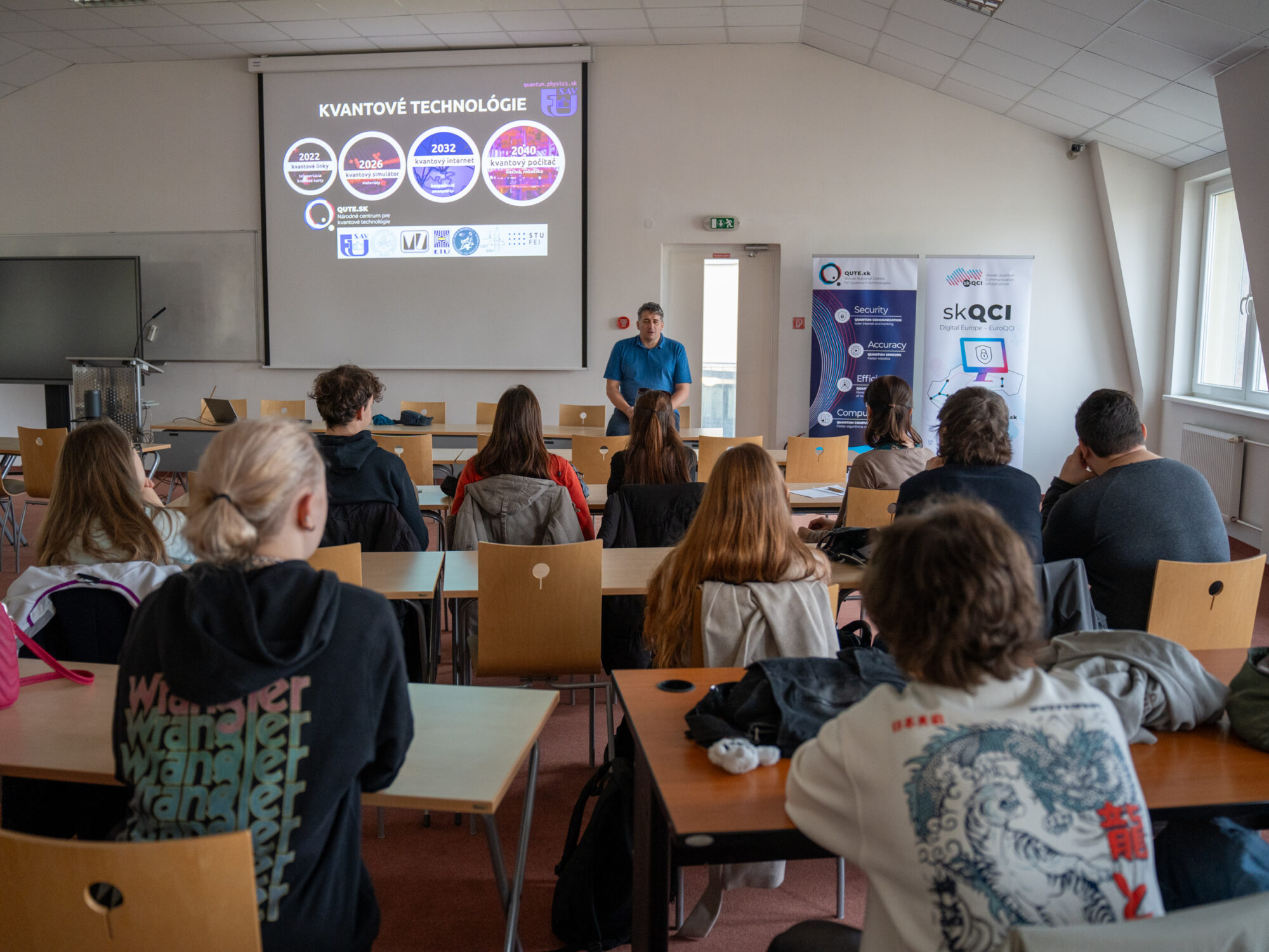 In the morning, students attended engaging talks in our auditorium, where they learned not only about quantum technologies, but also about other topics such a space, stars and black holes. Presentations by Mário Ziman and Andrej Liptaj from IP SAS provided an excellent starting point for students before diving into more interactive experiences during lab tours.